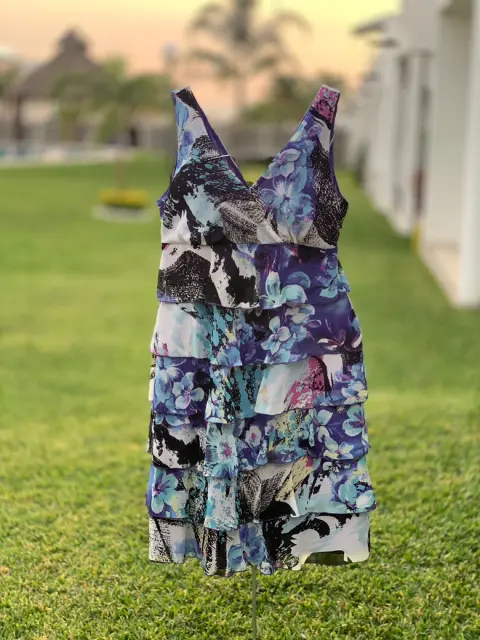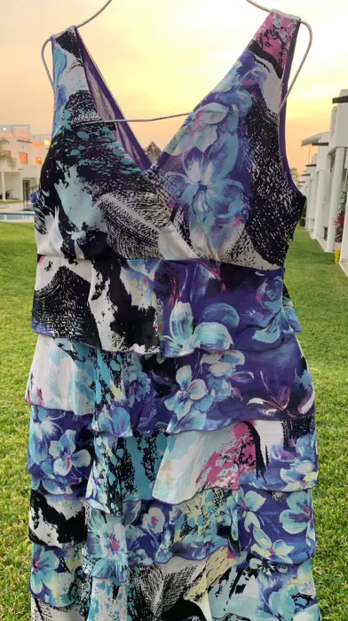 Vestido de capas de diseñador T. 34. Vestido con tirantes anchos y con capas del diseñador Eduardo RojoHecho en España con tela estampada en tonos lilas.Tiene forro y cierre invisible lateralTalla 34Para cualquier duda, por favor escríbeme!