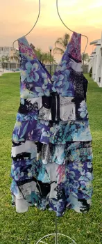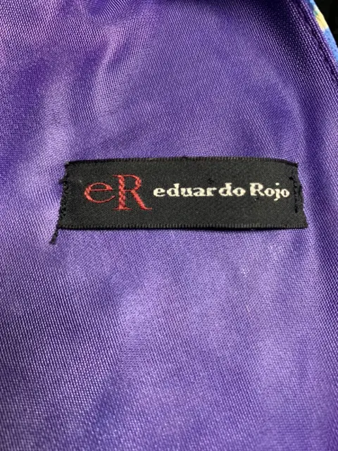 Vestido con tirantes anchos y con capas del diseñador Eduardo RojoHecho en España con tela estampada en tonos lilas.Tiene forro y cierre invisible lateralTalla 34Para cualquier duda, por favor escríbeme!