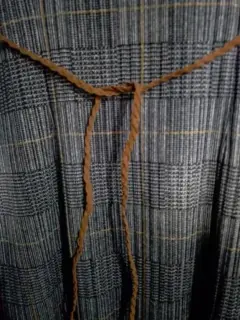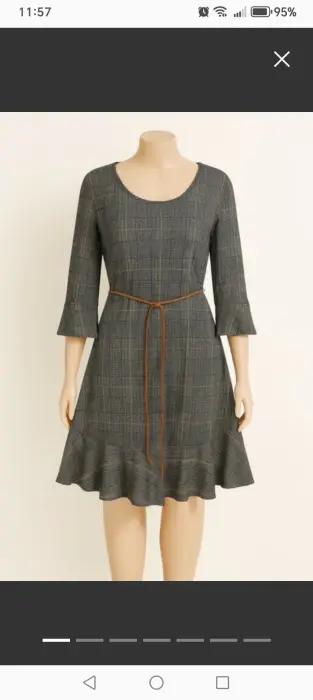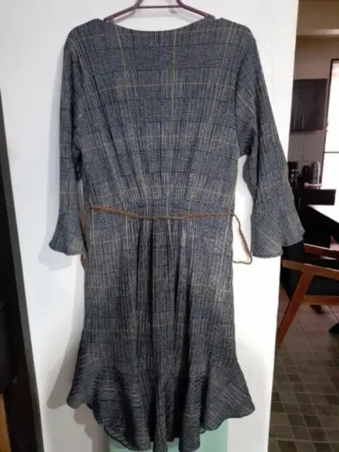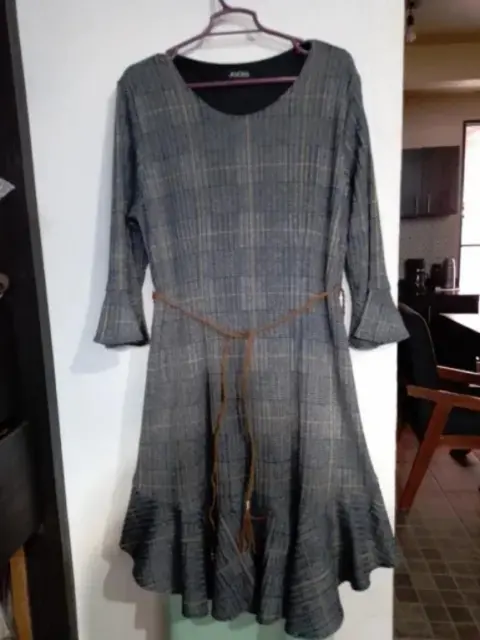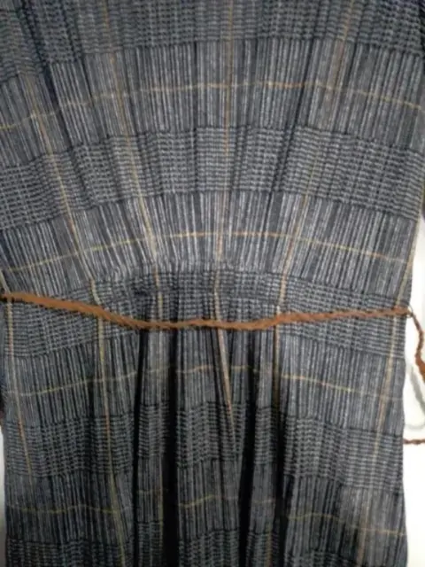 Vestido para cóctel, talla 38 marca Joces, forro y tela de vestido strech, cuadros de finas líneas negras y amarillas sobre fondo café griseceo , cinturón trenzado