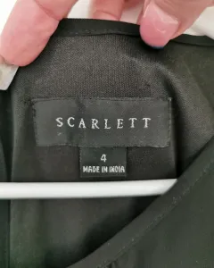 Vestido de coctel Scarlett. Vestido de coctel negro. Sin mangas. La parte superior es de tela de chifón transparente con bajo vestido. Tiene bordado de pedrería en las orillas de los lados. La falda es de tela tipo stretch. Talla 4.