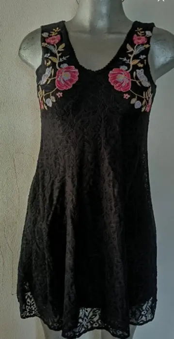 Vestido de encaje XHILARATION. Bonito vestido de encaje, decoraciónes de flores en la parte del pecho que lo hacen lucir especial, cierre en la parte de atrás y fondo negro.