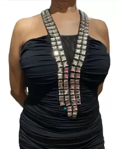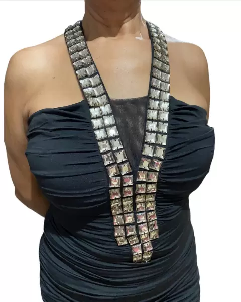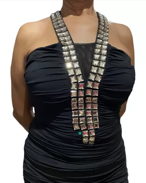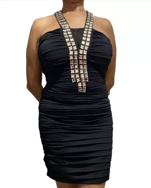 👗 Vestido de fiesta corto cuello tipo halter con pedrería color negro con pliegues trae forro amolda muy padre al cuerpo