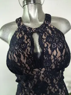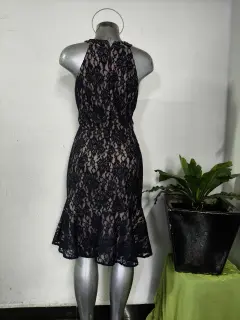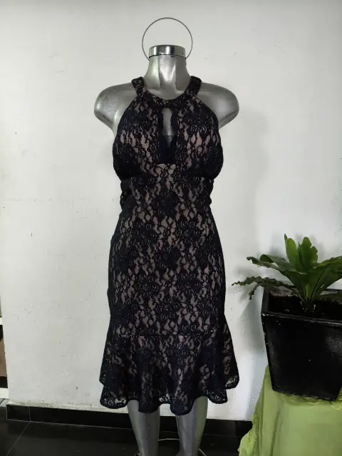 diseño de encaje floral en color azul marino sobre un forro en tono nude (o tostado), lo que crea un contraste elegante. Silueta ajustada y acampanada (fit and flare) que llega a la altura de la rodilla.