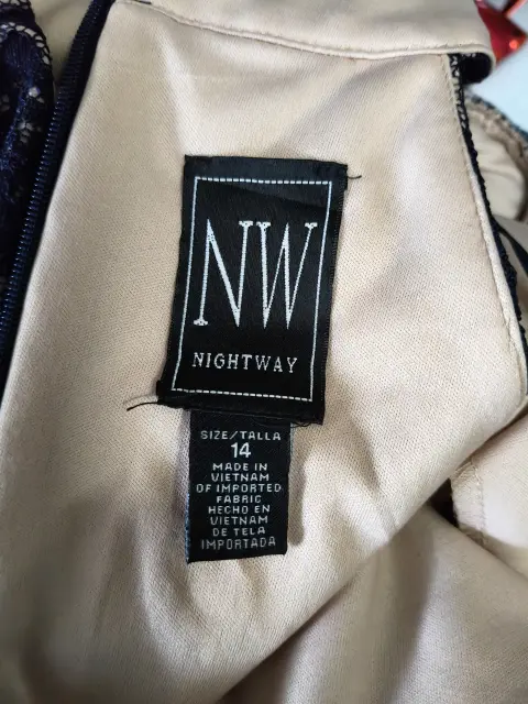 Vestido de fiesta brilloso. diseño de encaje floral en color azul marino sobre un forro en tono nude (o tostado), lo que crea un contraste elegante. Silueta ajustada y acampanada (fit and flare) que llega a la altura de la rodilla.