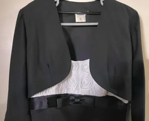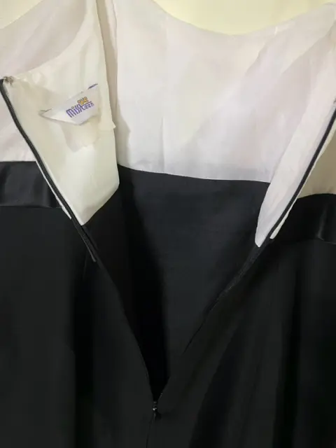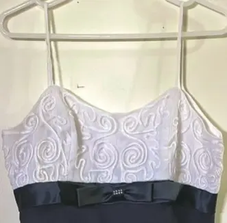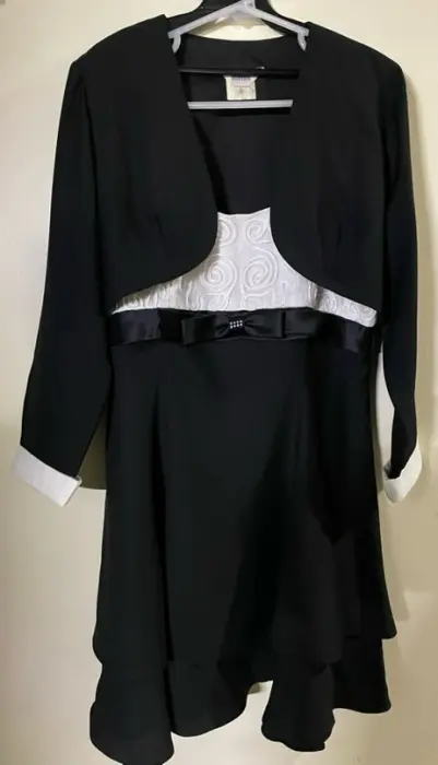 Vestido de fiesta blanco y negro, corto de tirantes con torera. En el top detalles de lazo, pretina de satin bajo el busto todo al rededor y detalle de moño al frente. Cierre trasero oculto. Doble falda y vuelo abajo. Ancho axila 47 cms. Largo desde el hombro 93 cms.
