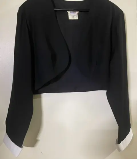Vestido de fiesta corto. Vestido de fiesta blanco y negro, corto de tirantes con torera. En el top detalles de lazo, pretina de satin bajo el busto todo al rededor y detalle de moño al frente. Cierre trasero oculto. Doble falda y vuelo abajo. Ancho axila 47 cms. Largo desde el hombro 93 cms.