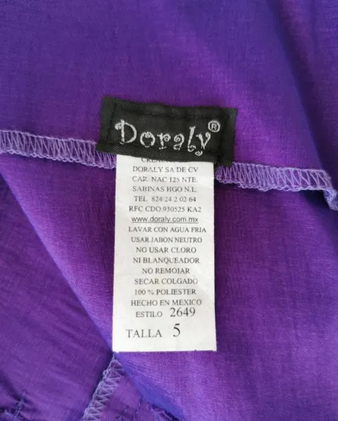 Vestido de fiesta Doraly. Vestido de tela tipo raso stretch. Color morado. Strapless. Con tablones en la cintura al frente y una flor de tela. Siper a la espalda. Talla S.