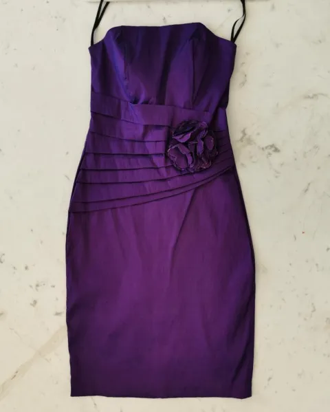 Vestido de tela tipo raso stretch. Color morado. Strapless. Con tablones en la cintura al frente y una flor de tela. Siper a la espalda. Talla S.