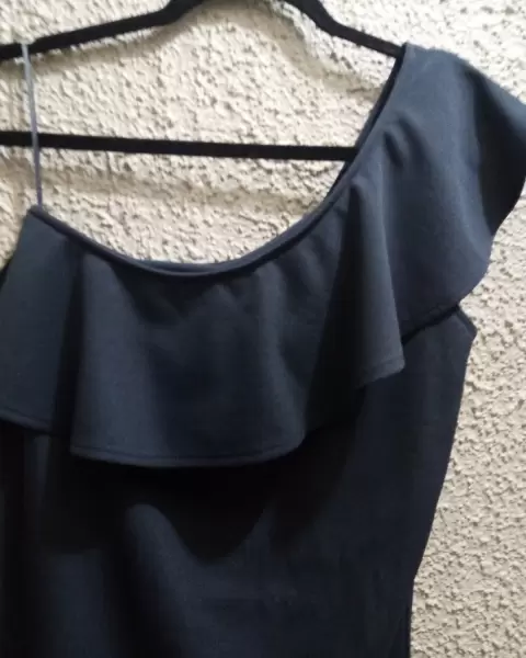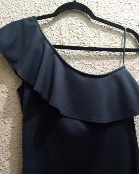 Vestido de hombro descubierto con olas en la parte superior es entre azulado y gris, trae forro No tiene detalles.