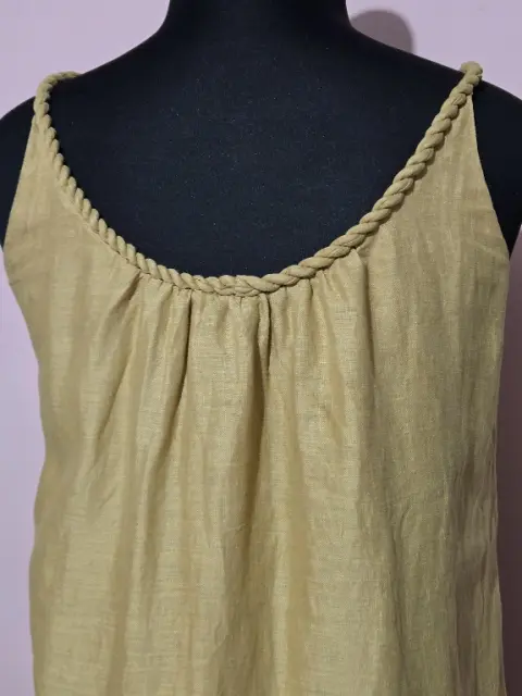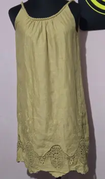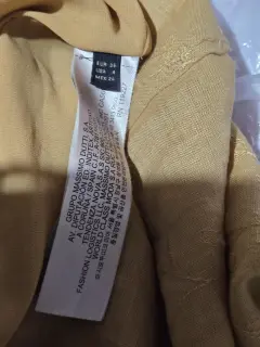 Vestido de lino massimo dutti. Vestido color amarillo oscuro tela ligera tipo lino, fondo interior ligeros solo para que no transparente la tela, bordados en la falda inferior del vestido, da a talla 30mx, sin detalles