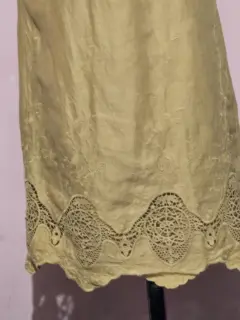 Vestido color amarillo oscuro tela ligera tipo lino, fondo interior ligeros solo para que no transparente la tela, bordados en la falda inferior del vestido, da a talla 30mx, sin detalles