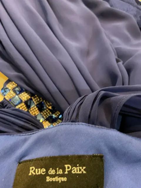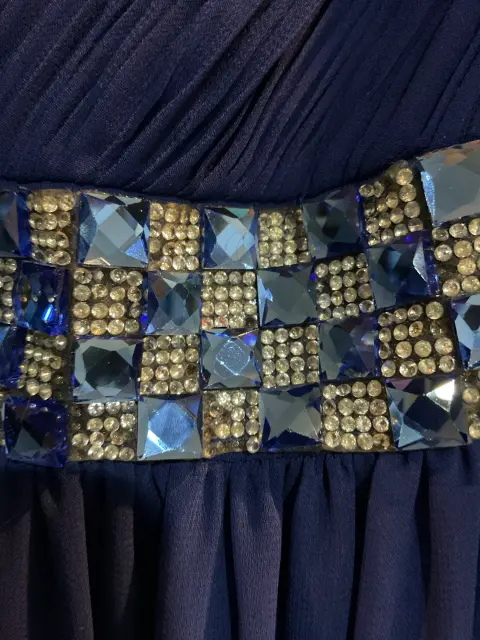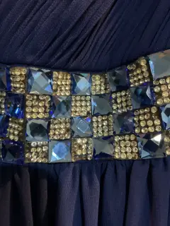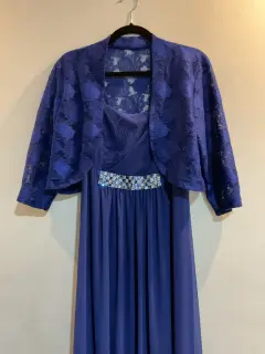 Vestido azul largo de noche, sus detalles de piedras lo hace brillar, puede ser con o sin chalequito