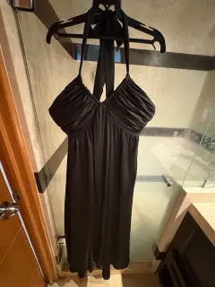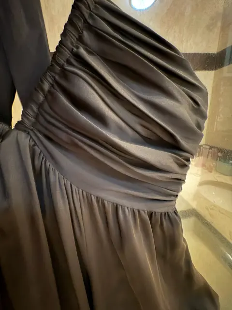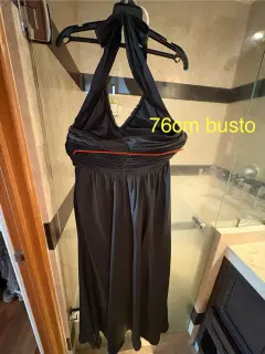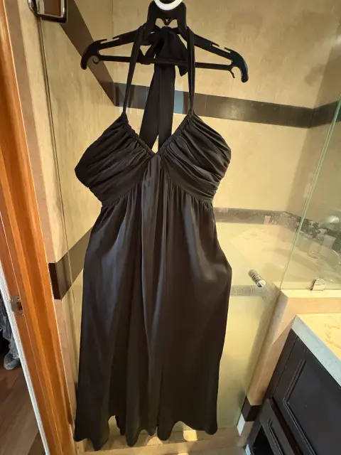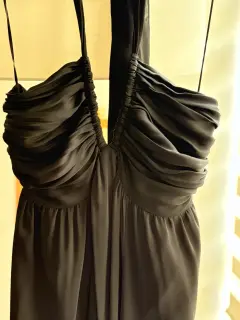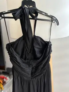 Vestido marca Julio color negro de tela como satin. Se sujeta del cuello. Trae doble fondo y de la cintura para abajo tiene una hermosa caida. Lo mas reducido es la parte del tronco/ debajo del busto. Talla 28-30