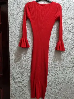 Vestido de punto color rojo largo con manga de campana y cuello redondo puesto una vez no tiene detalles.