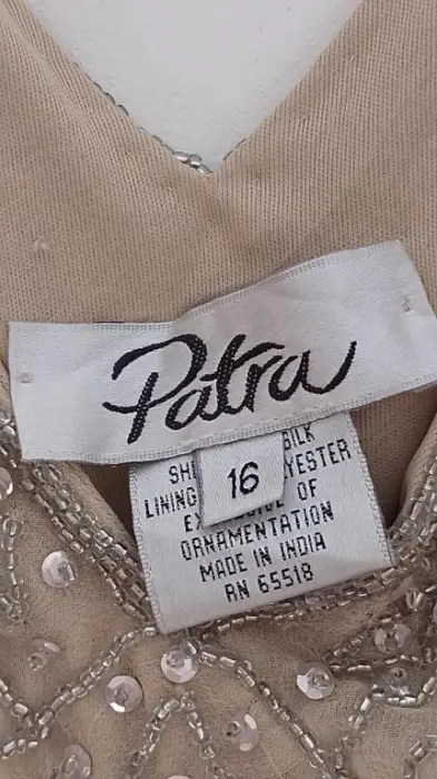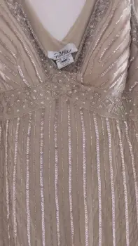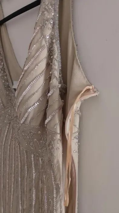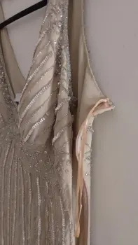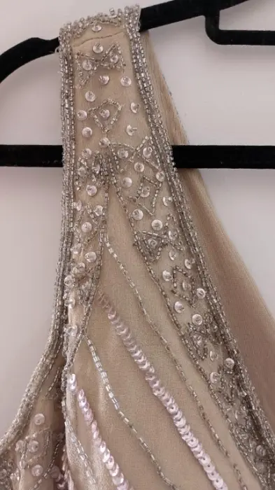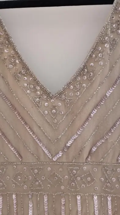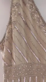 Vestido de seda sin mangas, bordado con chaquira, canutillo y lentejuelas, color nude con forro, cierre a un costado. Sin detalles.