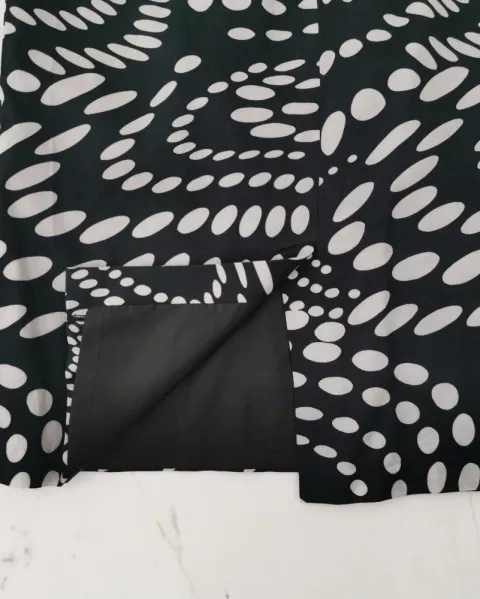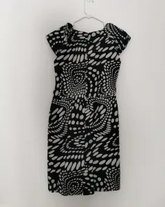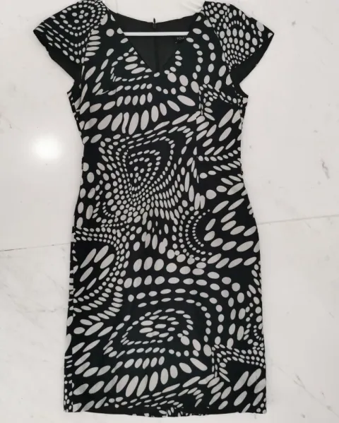 Vestido negro con estampado de óvalos blancos, con forro. Cuello casi en V. Mangas de Casquillo. Pinzas en la cintura al frente yen la espalda. Siper a la espalda. Falda recta con abertura atrás. Talla S.