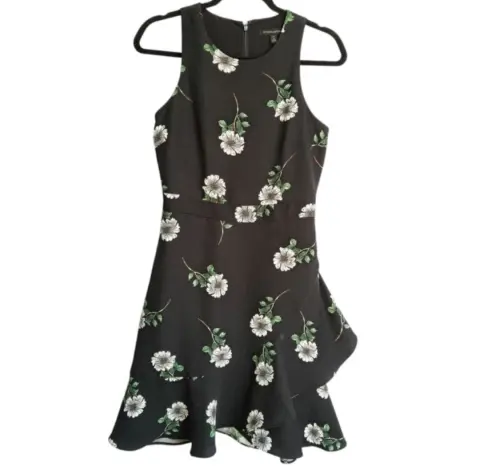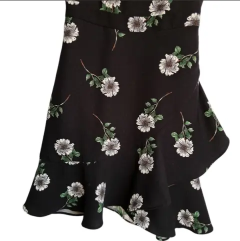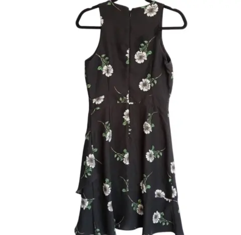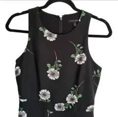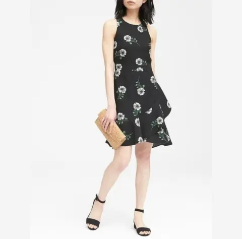 Vestido floral BANANA REPUBLIC. Vestido floral BANANA REPUBLIC Vestido sin mangas con estampado floral negro, Terminado con un hermoso dobladillo con volados femeninos. Totalmente forrado. Cierre de cremallera en la parte posterior. Talla 2 Medidas tomadas por un solo lado: *Axila-Axila 42 cm *Cintura 36 cm *Largo 98 cm