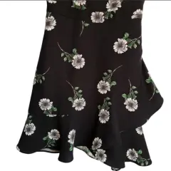 Vestido floral BANANA REPUBLIC Vestido sin mangas con estampado floral negro, Terminado con un hermoso dobladillo con volados femeninos. Totalmente forrado. Cierre de cremallera en la parte posterior. Talla 2 Medidas tomadas por un solo lado: *Axila-Axila 42 cm *Cintura 36 cm *Largo 98 cm