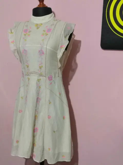 Vestido Free people Flores bordadas. Vestido beige con flores de colores bordados daba talla 28-30mx se ajusta con cierre de costado, ningún detalle funcional solo estético la parte trasera se deshizo parte del bordado en la espalda baja