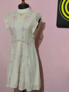 Vestido beige con flores de colores bordados daba talla 28-30mx se ajusta con cierre de costado, ningún detalle funcional solo estético la parte trasera se deshizo parte del bordado en la espalda baja