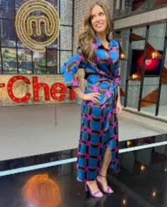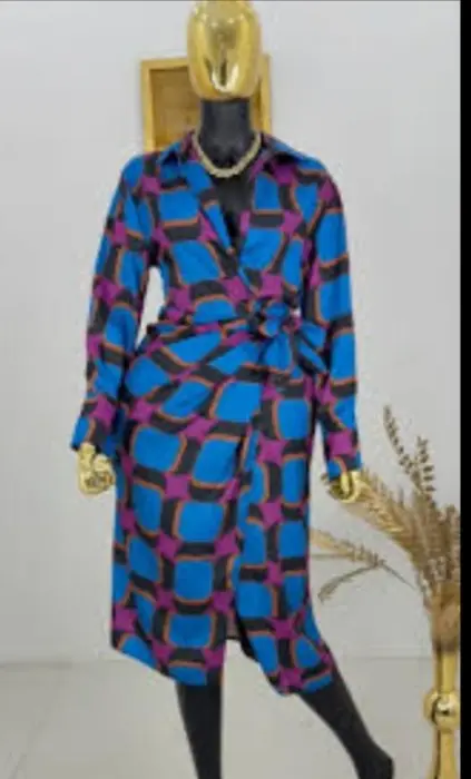Es un vestido cruzado (wrap dress) estampado de manga larga, Presenta un patrón geométrico distintivo en tonos vibrantes de azul, morado, negro y naranja, y está confeccionado en un tejido satinado o de seda sintética que le da un acabado brillante y una caída fluida.Estoy abierta a recibir ofertas