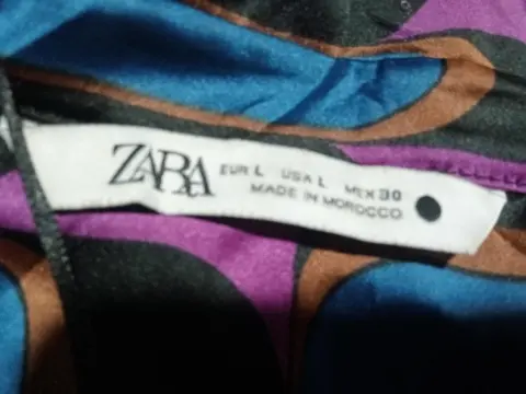 Vestido geometríco cruzado. Es un vestido cruzado (wrap dress) estampado de manga larga, Presenta un patrón geométrico distintivo en tonos vibrantes de azul, morado, negro y naranja, y está confeccionado en un tejido satinado o de seda sintética que le da un acabado brillante y una caída fluida.Estoy abierta a recibir ofertas