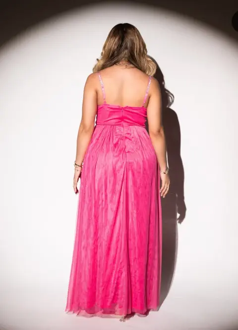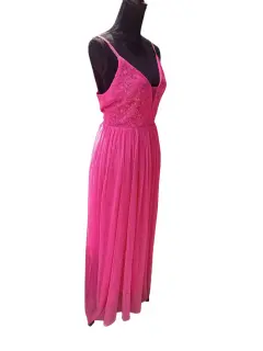 VESTIDO LARGO TALLA M FIUSHA. VESTIDO LARGO DE FIESTA, COLOR FIUSHA, MARCA HAUTE MONDE, TALLA M, DE HOMBRO A HOMBRO 38 CM, DE AXILA A AXILA 39 CM, DE LARGO 141 CM, CON MESH EN ESCOTE DE FRENTE