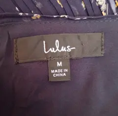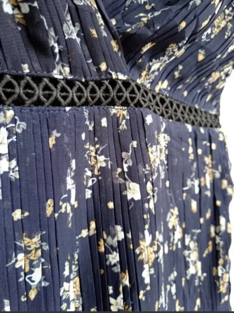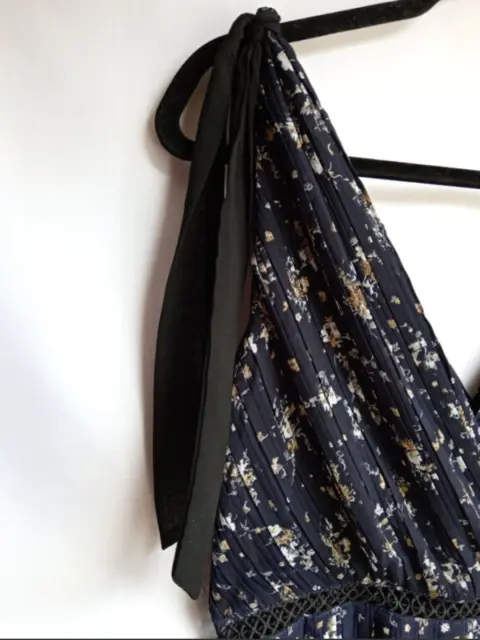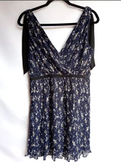 Vestido mini plisado LULUS Talla M Estampado floral azul marino. Tejido plisado de gasa, corpiño cruzado con detalles decorativos de lazo en los hombros. Una banda de crochet transparente en la cintura, cremallera oculto en el lateral Medidas tomadas por un solo lado: *Axila-Axila 44 cm *Cintura 38 cm *Largo 86 cm ⚜️ Por favor si vas a ofertar que sea solo porque tú compra será segura ⚜️