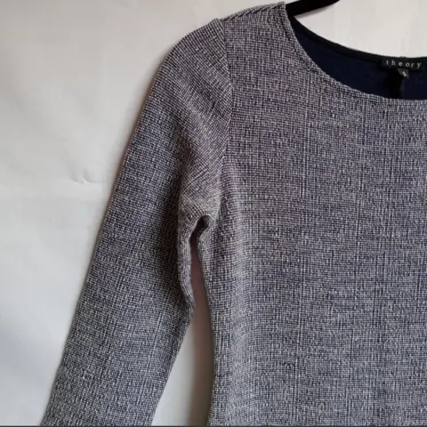 Vestido mini THEORY. Vestido mini THEORY Mini vestido de punto Theory boucle, talla mediana. Patrón azul marino y blanco, mangas de tres cuartos de largo y cuello de barco, 100% algodón Talla S Medidas tomadas por un solo lado: *Hombros 33 cm *Axila-Axila 40 cm *Largo 78 cm