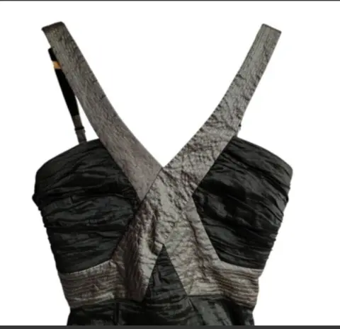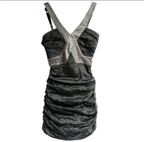 Vestido mini vintage Y2K BCBGMAXAZRIA. Vestido mini vintage Y2K BCBGMAXAZRIA Talla 4 Precioso negro/gris, metalizado con escote en pico profundo. Tejido fruncido. Es ligeramente elástico y se ajusta cómodamente a la piel. Tirantes ajustables y cremallera trasera Medidas tomadas por un solo lado: *Axila-Axila 37 cm *Cintura 30 cm *Cadera 40 cm *Largo 72 cm ⚜️ Por favor si vas a ofertar que sea solo porque tú compra será segura ⚜️