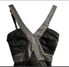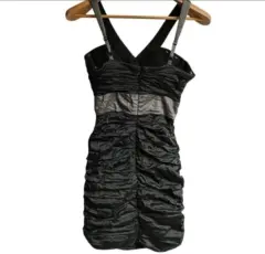 Vestido mini vintage Y2K BCBGMAXAZRIA Talla 4 Precioso negro/gris, metalizado con escote en pico profundo. Tejido fruncido. Es ligeramente elástico y se ajusta cómodamente a la piel. Tirantes ajustables y cremallera trasera Medidas tomadas por un solo lado: *Axila-Axila 37 cm *Cintura 30 cm *Cadera 40 cm *Largo 72 cm ⚜️ Por favor si vas a ofertar que sea solo porque tú compra será segura ⚜️