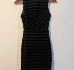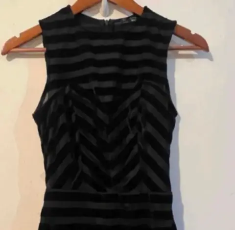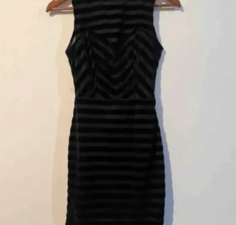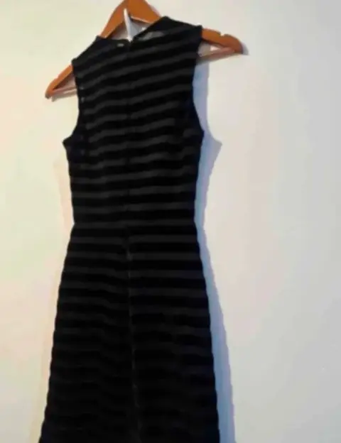 Vestido negro Berskha terciopelo. Lindo vestido color negro, con estampado de rayas en terciopelo delgado y fino .Luce elegante ,Podría usarse para algún disfraz de hallowen