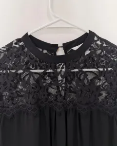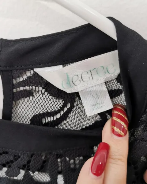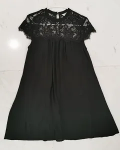 Vestido negro con encaje Decree. Vestido de tela tipo chifón, color negro. Con encaje en la parte superior, en frente y a la espalda y en las mangas. El vestido es línea A y tiene zurcido en el pecho. Talla M.