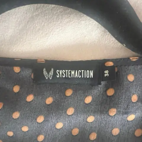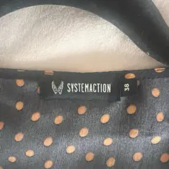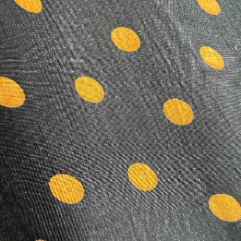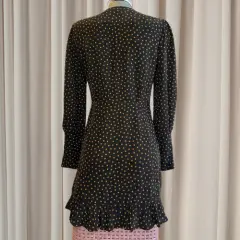 Vestido negro con lunares mostaza corto. Elegante vestido corto de manga larga, 100% cupro (El cupro es una fibra suave con un tacto similar al de la seda, de composición casi orgánica y de gran durabilidad. Las prendas confeccionadas con este material se caracterizan por una gran caída y un movimiento perfecto.)