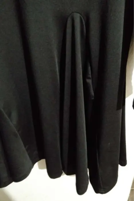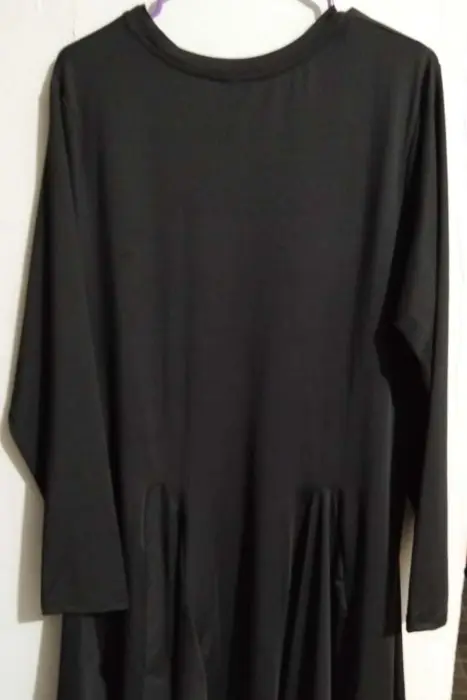 Vestido negro de manga larga con cuello redondo y dobladillo acampanada, tela elastica, 92 cm largo, 105 cm pecho, 95 cm cintura, 170 cm cadera, tela elastica ligeraEnvío a la brevedad