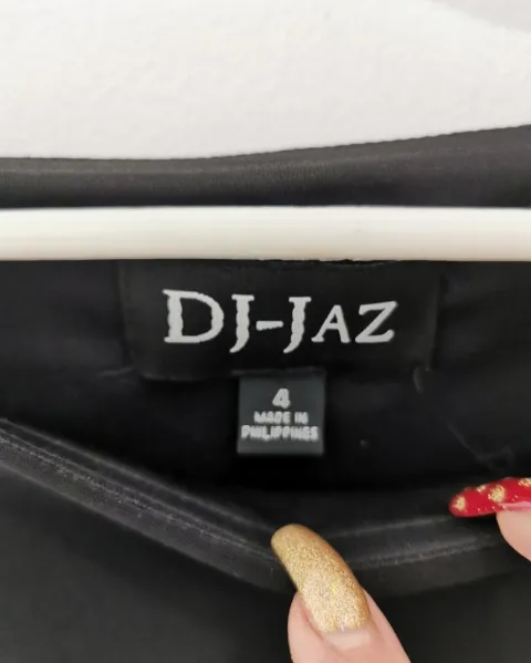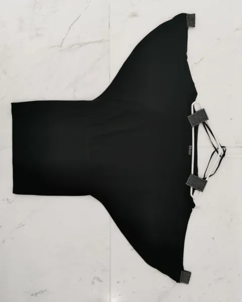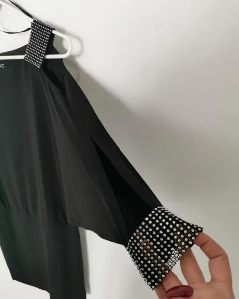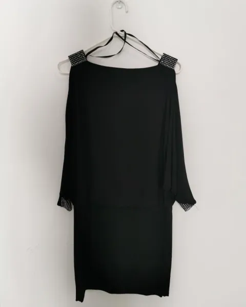 Vestido negro DJ-Jaz. Vestido de tela tipo stretch. Color megro con detalles plateaados en hombros y mangas. La parte de arriba es tipo blusón con mangas largas tipo murciélago la falda es entubada y corta. Talla S.