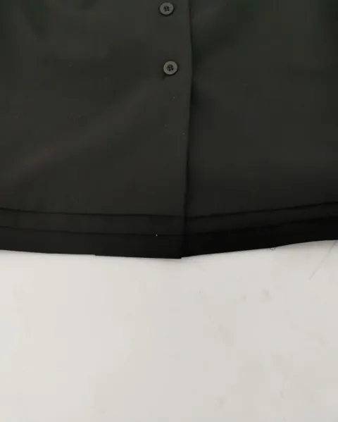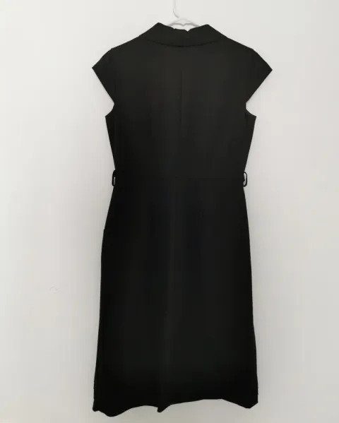 Vestido camisero negro con forro. Cuello de solapa tipo traje. Con mangas de casquillo corte a la cintura con pinzas. Falda recta con acabado de tablones horizontales. Talla S.