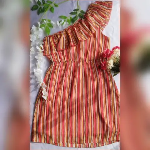 Vestido Bisou Bisou para mujer, de un solo hombro, rayas, olan, altura por encima de la rodilla, tiene forro y resorte en la cinturano incluye cinto.Talla 10 (M)Medidas tomadas por un solo lado:*A-A 46 cm*Cintura 38 cm, tiene resorte y estira hasta 45 cm*Largo 93 cm
