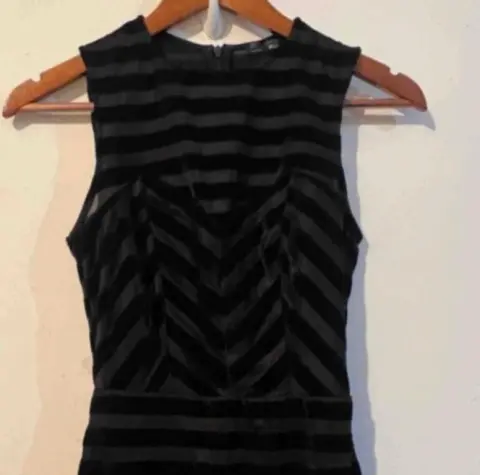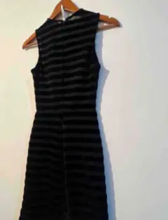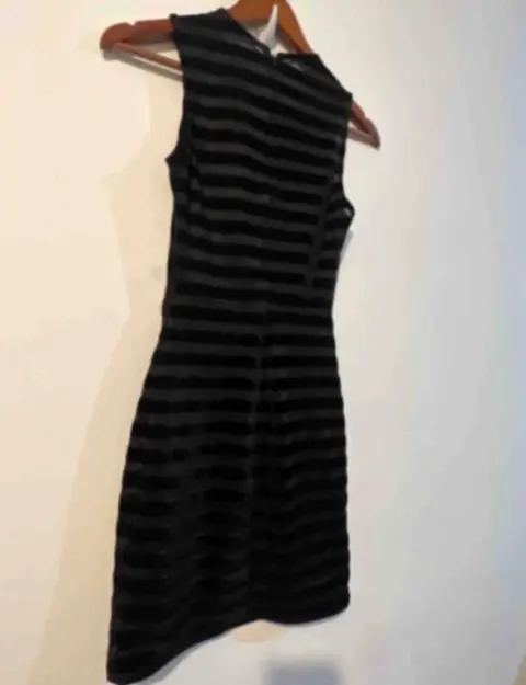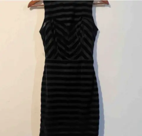 Hermoso y sexy vestido de rayas , de terciopelo delgado , color negro . Marca: BERSKHA USO MÁXIMO 3 veces Talla : 26 (Ch) podría quedar a xs