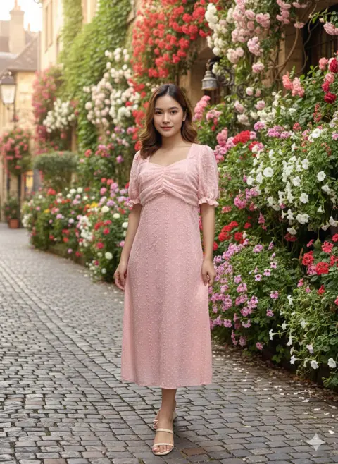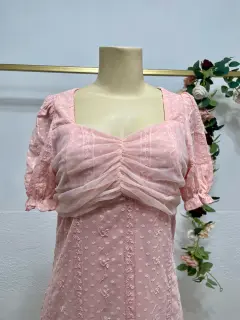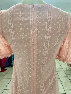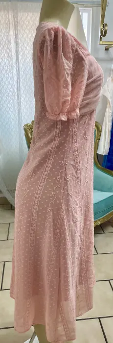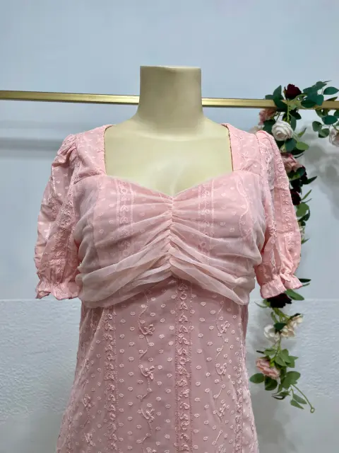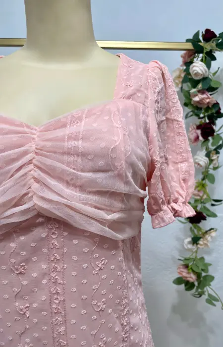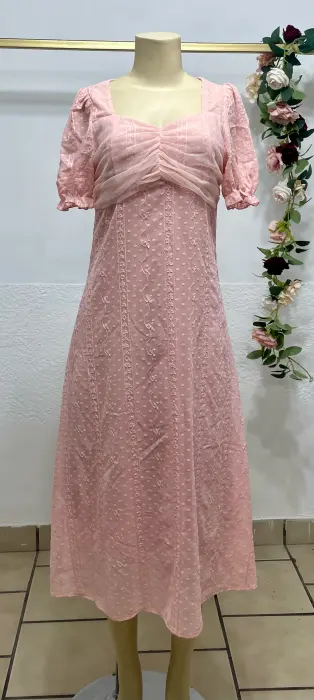 Vestido rosa claro M. Lindo vestido de tela ligera con manga corta; busto drapeado; nuevo sin etiqueta; corte abajo de la rodilla