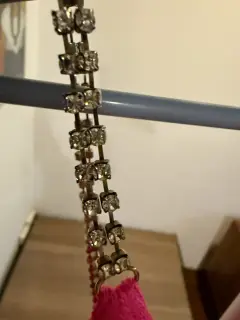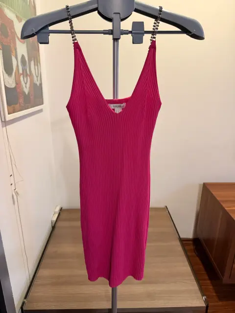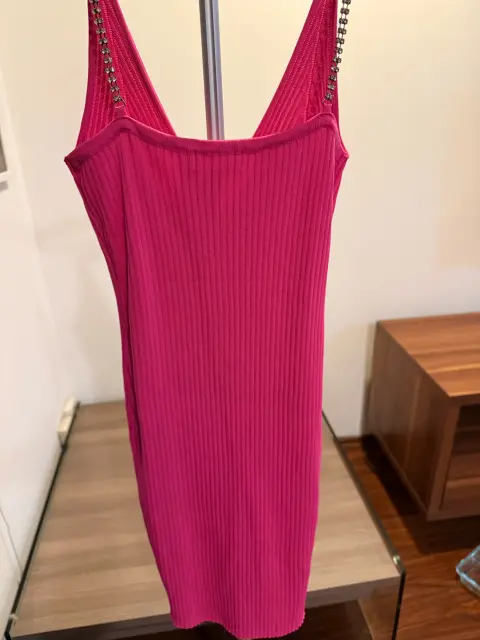Vestido rosa corto stretch que se ajusta cómodamente al cuerpo. Sus tirantes tienes una piedras que le dan muy buen toque