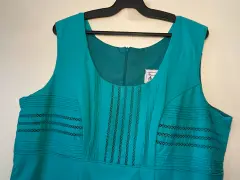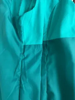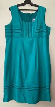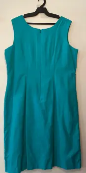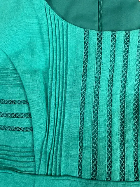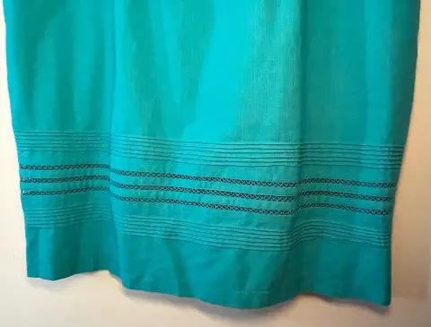 Bonito vestido sin mangas, verde agua, con forro y cierre oculto en la espalda. Hecho en Yucatán. Con el estilo de las Guayaberas. Largo arriba de la rodilla 92 cms, ancho axila 48 cms. Dice talla 38, pero real es como 34. Nunca usado. Sin detalles.