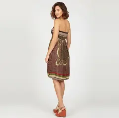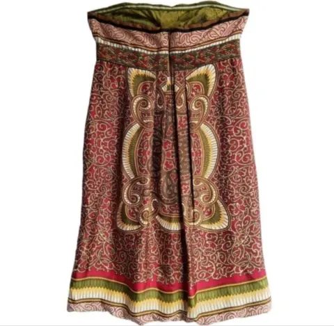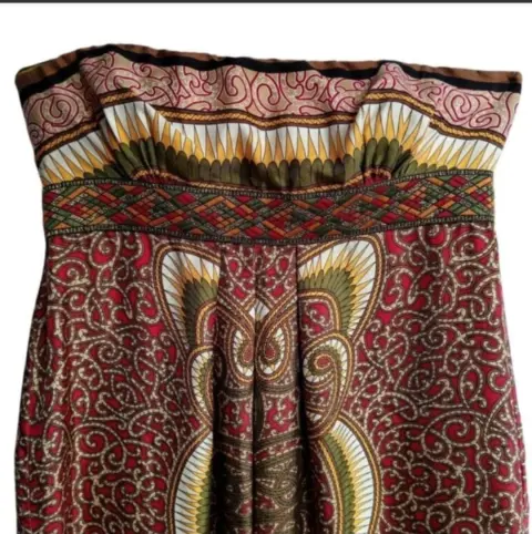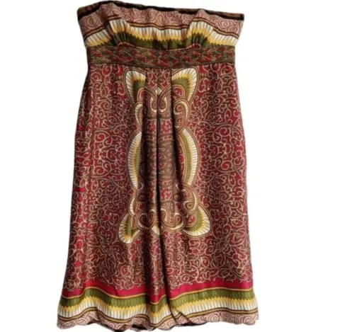 Vestido strapless NICOLE MILLER Talla 12 100 % seda. Vestido bohemio estilo pañuelo sin tirantes, suave y sedoso. Como un elegante pañuelo vintage. Cremallera con cierre de velcro Medidas tomadas por un solo lado: *Axila-Axila 43 cm *Cintura alta 40 cm *Largo 86 cm ⚜️ Por favor si vas a ofertar que sea solo porque tú compra será segura ⚜️