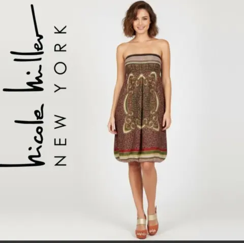Vestido strapless NICOLE MILLER. Vestido strapless NICOLE MILLER Talla 12 100 % seda. Vestido bohemio estilo pañuelo sin tirantes, suave y sedoso. Como un elegante pañuelo vintage. Cremallera con cierre de velcro Medidas tomadas por un solo lado: *Axila-Axila 43 cm *Cintura alta 40 cm *Largo 86 cm ⚜️ Por favor si vas a ofertar que sea solo porque tú compra será segura ⚜️