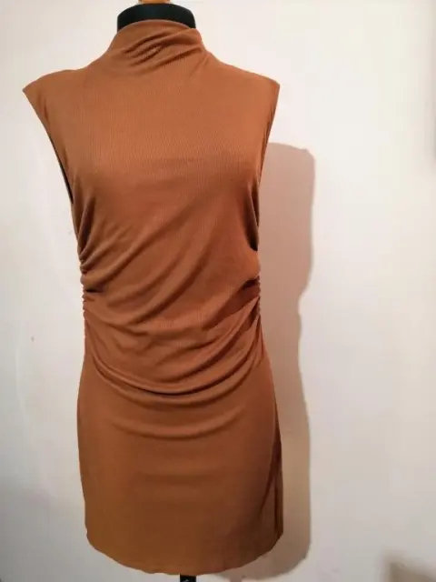 Vestido stretch naranja oscuro con frunces al costado, cuello semi alto, tela tejido tipo canale algodón, una puesta sin detalles, el cinturón da una sugerencia de uso pero no se incluye, dice G pero da entre 32-36, largo mide 84cm desde el hombro, marca Micas
