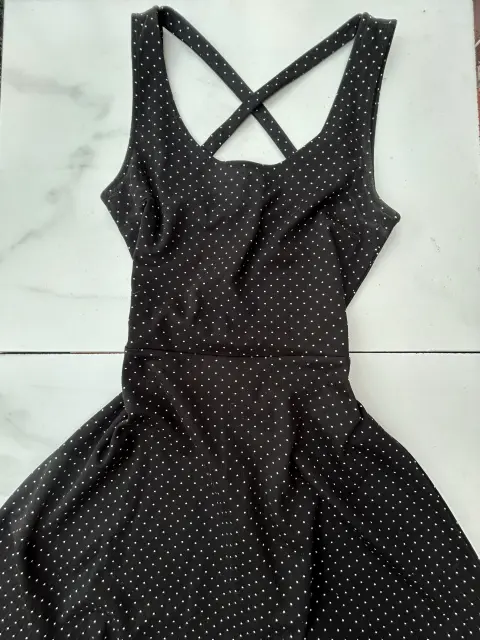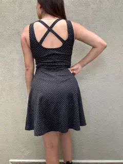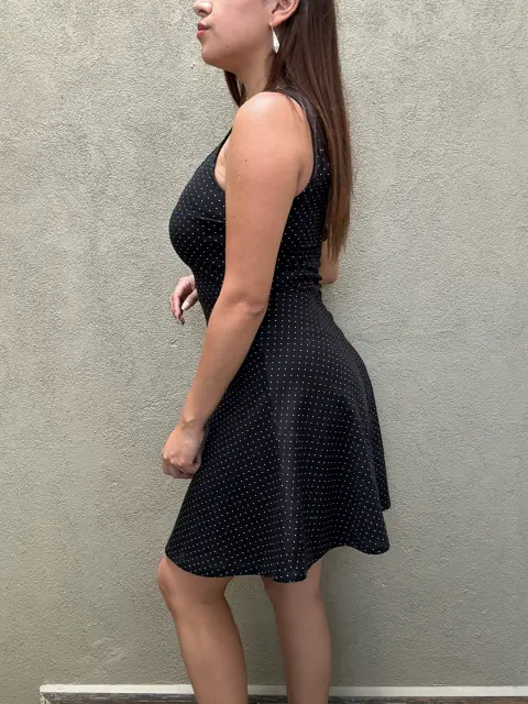 Vestido con vuelo color negro con puntos blancos. Talla XCH también le queda a CH. Medidas: Cintura 33 cm, Pecho 37 cm, Largo 88 cm. Marca H&M.