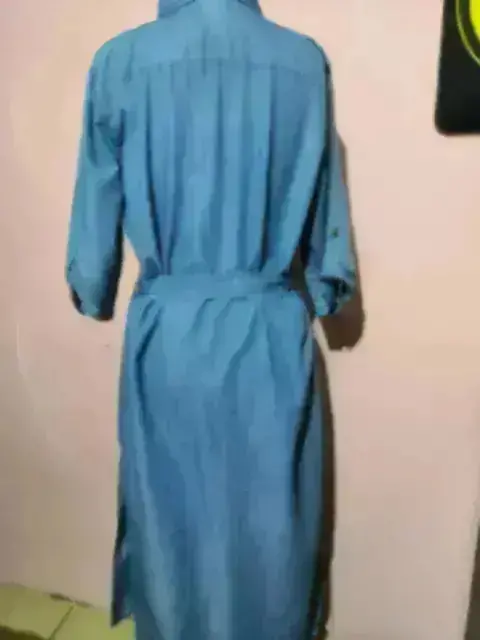 Tela tipo mezclilla ligera, con abertura en los costados, mide 62 axila a axila y 129 CM de largo, el cinto es ajustable y el vestido fa entre talla 36-38 MX