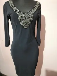 Vestido tipo cóctel con Pedrería. Vestido azul marino con Pedrería plateada, da entre talla 30-32 tela stretch mide 86 CM largo
