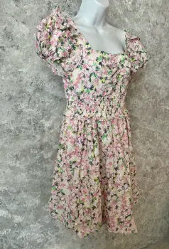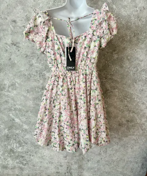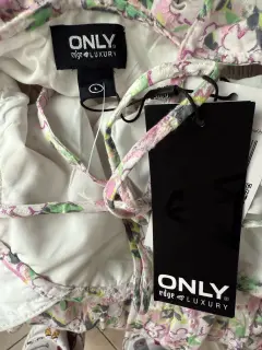 Vestido tipo globo ONLY Edge Luxury. Vestido corto de la marca europea ONLY de su línea Edge Luxury, especializada en prendas modernas con acabados delicados Corte globo ligero, con pretina elástica que estiliza la figura, mangas abullonadas con delicados olanes que añaden volumen y un aire vintage, moño decorativo en la espalda y forro interno blanco para mayor comodidad. Diseño que combina dulzura, estilo y un toque romántico.