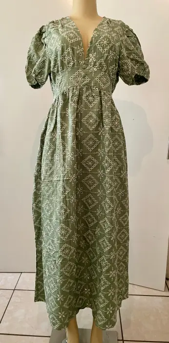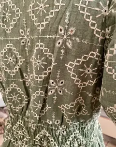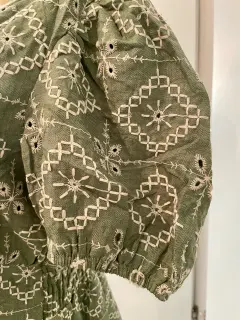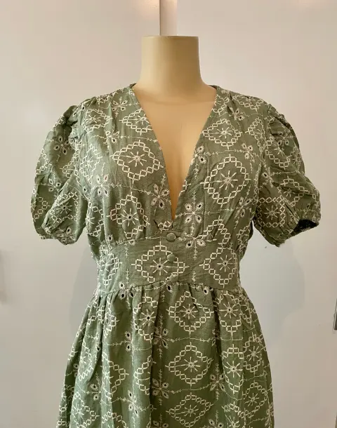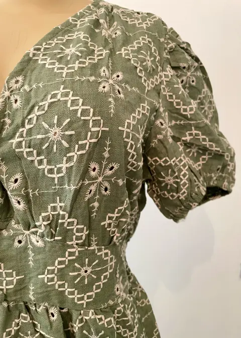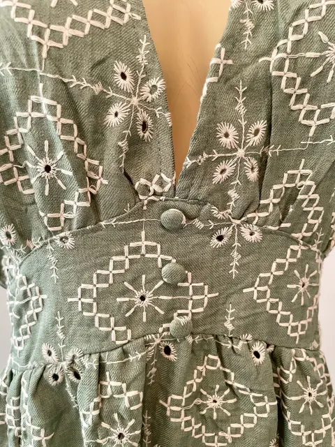 Vestido verde aceituna bordado M. Hermoso vestido bordado con botones forrados de adorno y elástico en la espalda; nuevo, con etiqueta
